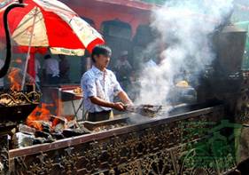不一会肉就烤好了,端上桌子让我目瞪口呆,一尺半长的红柳枝上串着六七块鸡蛋大小的羊肉,恐怕要有半斤多重。烤肉焦黄滋润,油光闪闪,散发着诱人的香味。我咬下一块烤肉,使劲地嚼了起来,果然名不虚传,肉块虽大但烤得很透,外表焦黄但肉质鲜嫩,孜然和辣椒与肉香混在一起,真的是有滋有味,仔细品味,其中还有淡淡的植物香味,这大概是红柳烤肉独有的味道了。一转眼两串儿烤肉就下了肚,朋友见我如此吃相,又安排老板给我考了一串儿。